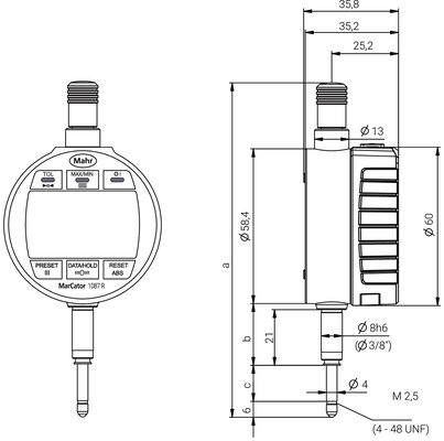 Funktionen ON/OFF, mm/inch, RESET (Nullsetzen der Anzeige), 0 (analoge Skalenanzeige auf Null setzen), PRESET (Maßvoreinstellung) - 3 Werte möglich, MAX/MIN Speicher zur Umkehrpunktsuche, (MAX-MIN) zur Rundlauf- und Ebenheitsprüfung, Analoge Skale (Darstellung mit Zeiger oder als Balken), TOL (Toleranz- und Warngrenzen-Eingabe) - 3 Toleranzen möglich, ABS (Anzeige kann auf Null gesetzt werden ohne den Bezug zum Preset zu verlieren), Faktor (Multiplikator für Messweg), Zählrichtungsumkehr, Ziffernschrittwert umstellbar, LOCK-Funktion (allgemeine Tastensperre im Menü sowie individuelle Tasten- und Menüsperren für prozessichere Messungen per Software MarCom), Datenschnittstelle Bi-Direktional (zur Datenabfrage - Übertragung von Parametern - Fernbedienung - indiv. Funktionssperren per Software MarCom), Fernbedienbar per Software MarCom, DATA (Datenübertragung), HOLD (aktuellen Messwert einfrieren)